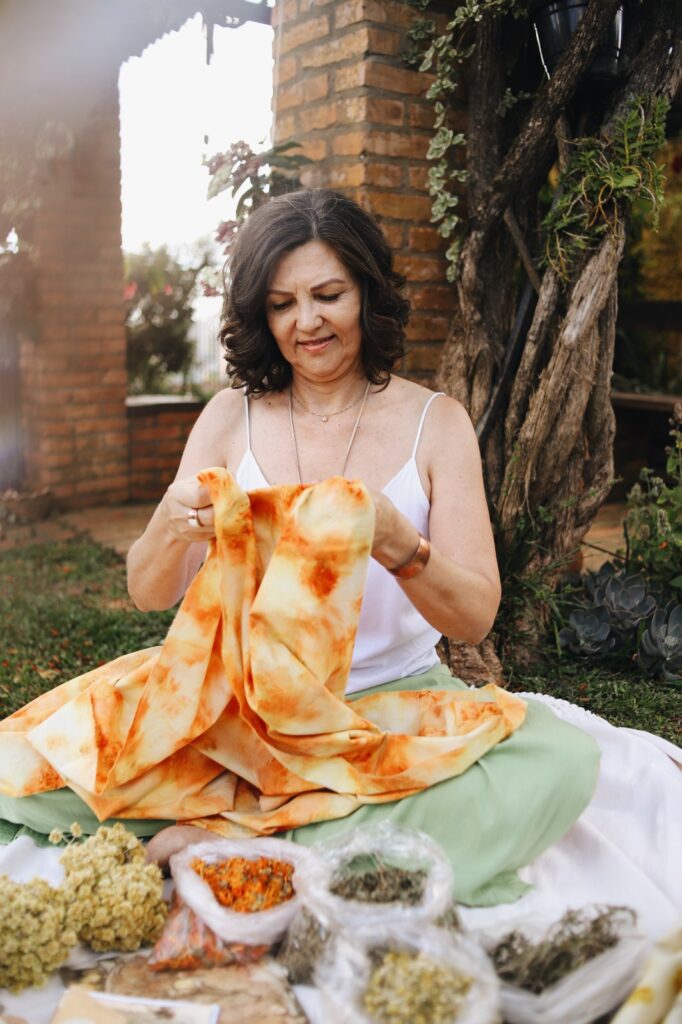 “Colho apenas o necessário, em respeito à planta e ao seu ciclo. Quero que ela permaneça viva. Reaproveito resíduos como cascas de abacate, romã, cebola, araucária, caroço de abacate, cúrcuma e urucum. E, quando possível, uso tecidos de algodão de cultivo agroecológico”, enfatiza.